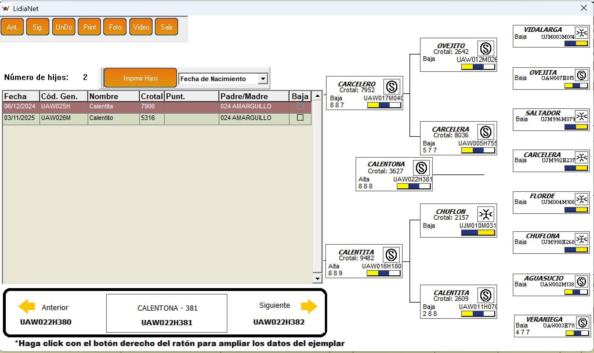 Se puede buscar los hijos, hermanos y nietos de un animal directamente desde la ventana de Ejemplares