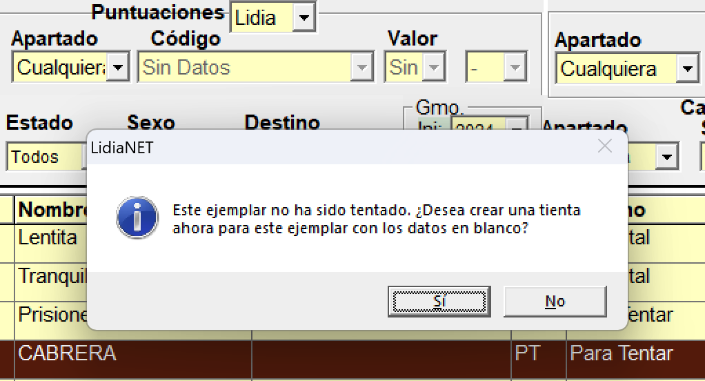 Mejoras en la entrada de puntuaciones de tientas desde la ventana principal de ejemplares o desde el árbol genealógico. Seleccionando un animal, mediante teclas CTRL+T se accede a la tienta. Si existe permite modificarla y si no existe la crea. Por defecto pone la fecha de tienta a los dos años de la fecha de nacimiento.