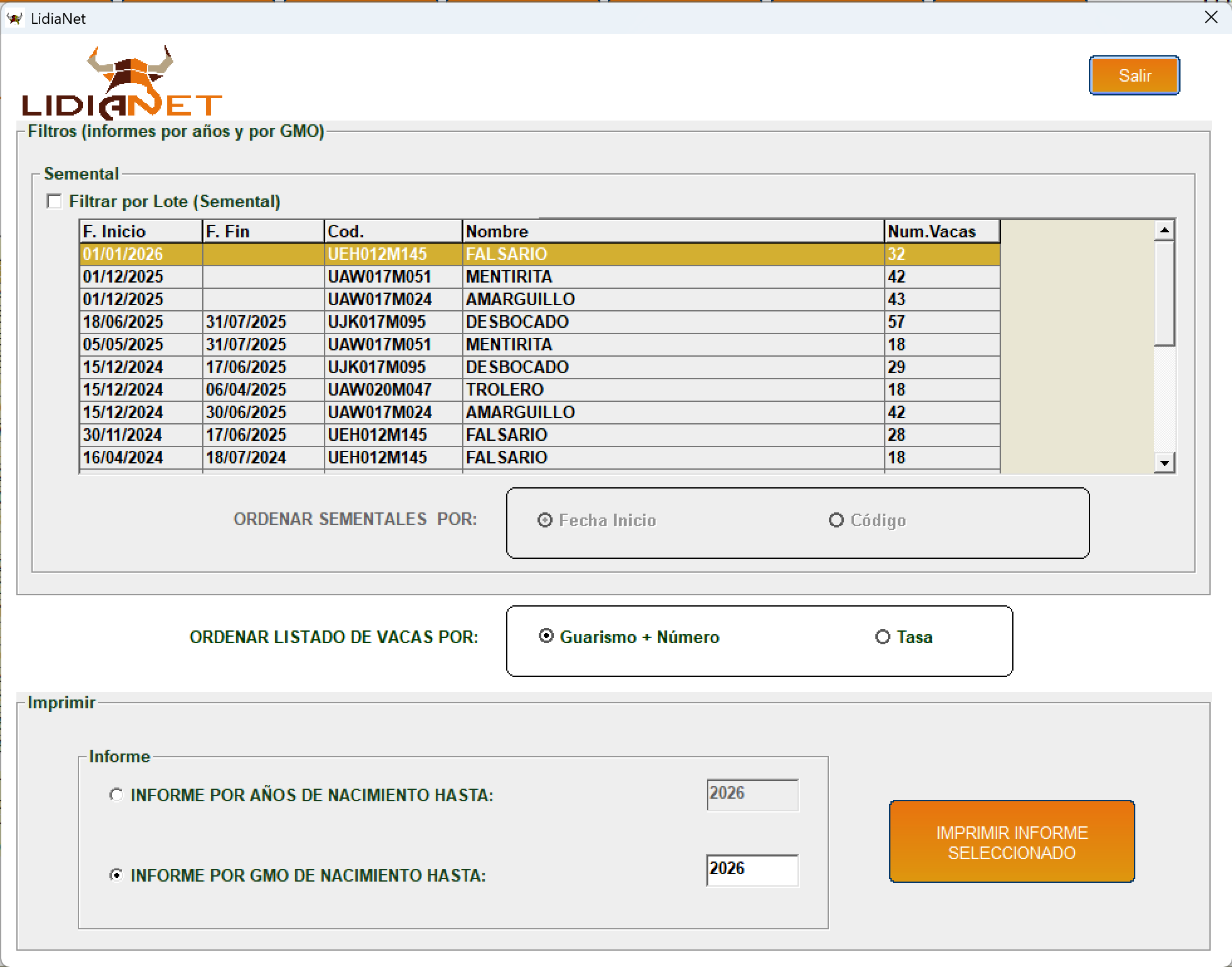 Se añade la opción de obtener el informe por fecha de nacimiento de los becerros o por guarismo.