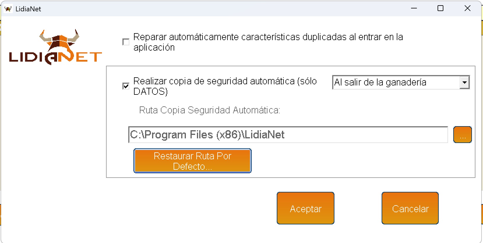 Se permite configurar, de forma automática, hacer copias de seguridad, bien al entrar en lidianet, al salir o en ambas ocasiones.